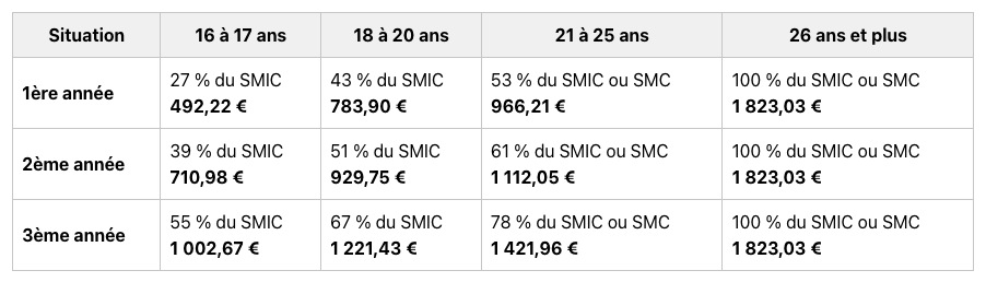 Grille de rémunération de l’apprenti (A la charge du club – au 1er janvier 2026) :