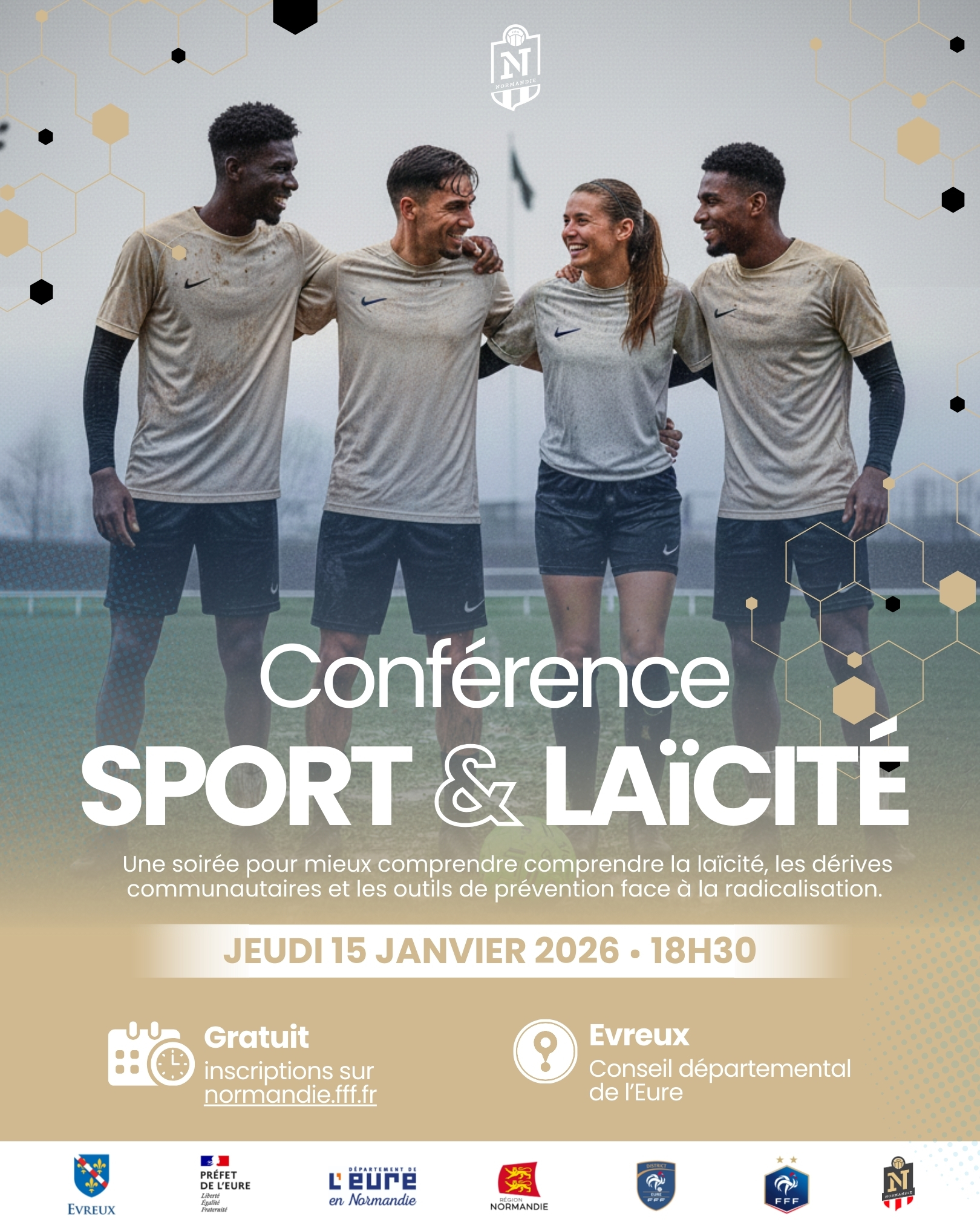 La Ligue de Football de Normandie et le District de l’Eure, en partenariat avec la Préfecture et le Département de l’Eure, vous invitent à une conférence intitulée « Sport et atteintes à la neutralité », le jeudi 15 janvier 2026 à 18h30 à l’Hôtel du Département de l’Eure à Évreux.