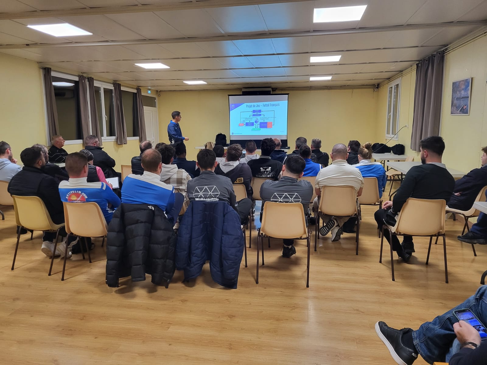 Une quarantaine d’éducateurs et d’éducatrices se sont réunis à la mairie de Bueil, où Clément leur a présenté en détail le projet de jeu commun aux sélections nationales, réalisé en partenariat avec l’ensemble des staffs.