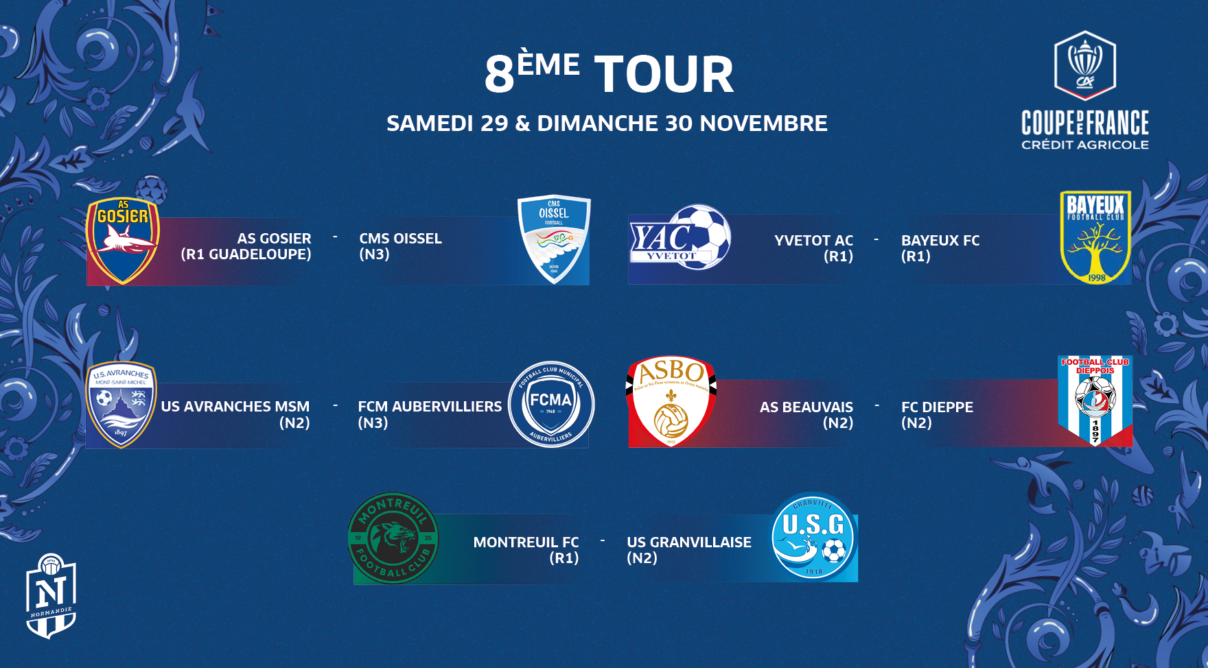 Le 8ᵉ tour de la Coupe de France Crédit Agricole a livré son verdict et réserve de belles affiches pour nos clubs normands. Entre derby régional, déplacement en Guadeloupe et duel de National 2, ce tour s’annonce passionnant et déterminant pour la suite de l’aventure en Coupe.