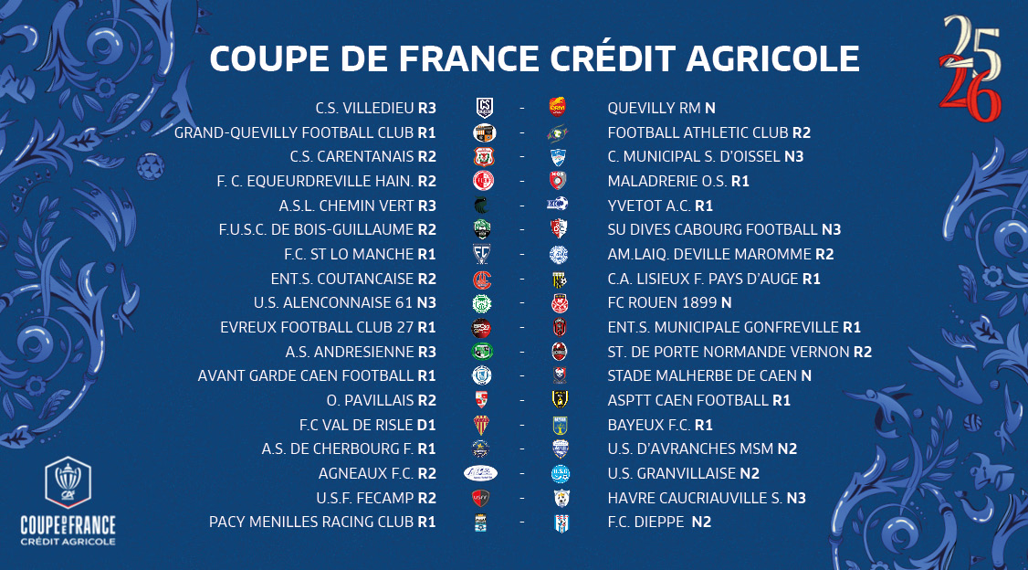 De magnifiques affiches ont été dévoilées : L’Avant-Garde de Caen, équipe de R1, se mesurera au Stade Malherbe de Caen, qui évolue en National. Le CS Villedieu aura l’honneur d’accueillir l’équipe de National, QRM. Avec deux divisions d’écart, l’US Alençon aura la tâche de recevoir le FC Rouen 1899.