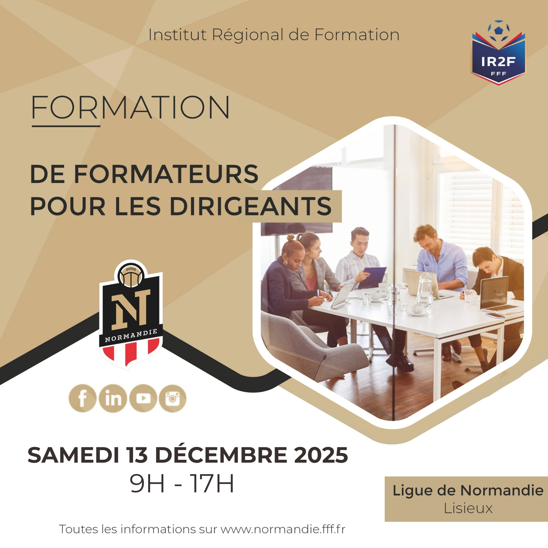 Afin de renforcer notre dispositif de formation destiné aux dirigeants, la Ligue met en place une opération de recrutement de nouveaux intervenants pour animer les formations tout-terrain. Une journée de formation des futurs formateurs est programmée le samedi 13 décembre 2025, de 9h à 17h, au siège de la Ligue de Football de Normandie à Lisieux.