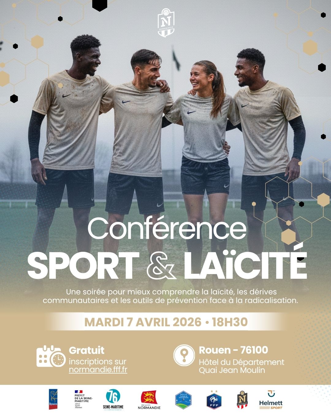 La Ligue de Football de Normandie et le District de la Seine-Maritime, en partenariat avec la Préfecture et le Département, ont le plaisir de vous convier à la 3ᵉ édition d’une conférence intitulée « Sport et atteintes à la neutralité », qui se tiendra le mardi 7 avril 2026 à 18h30, à l’Hôtel du Département de la Seine-Maritime à Rouen (76100).