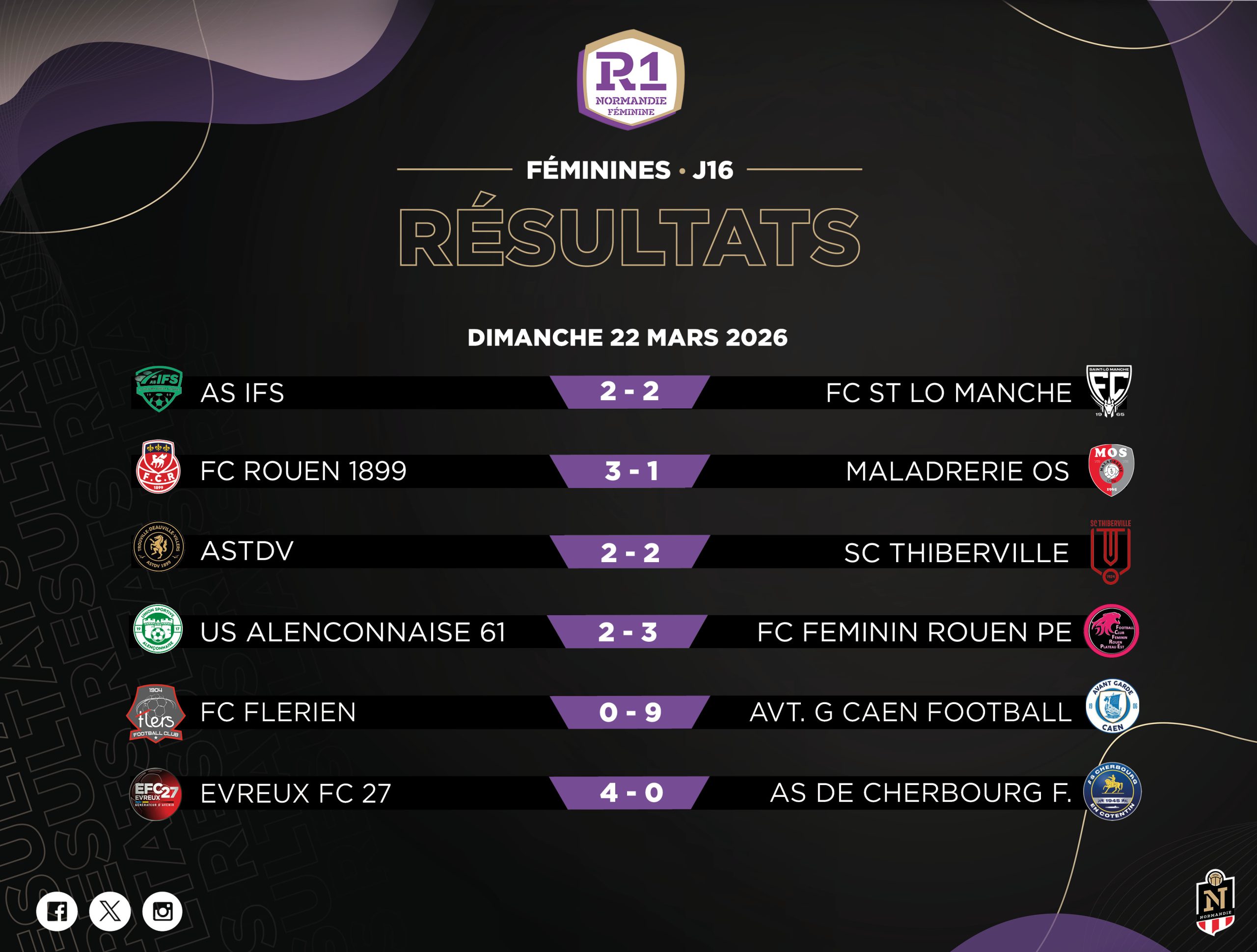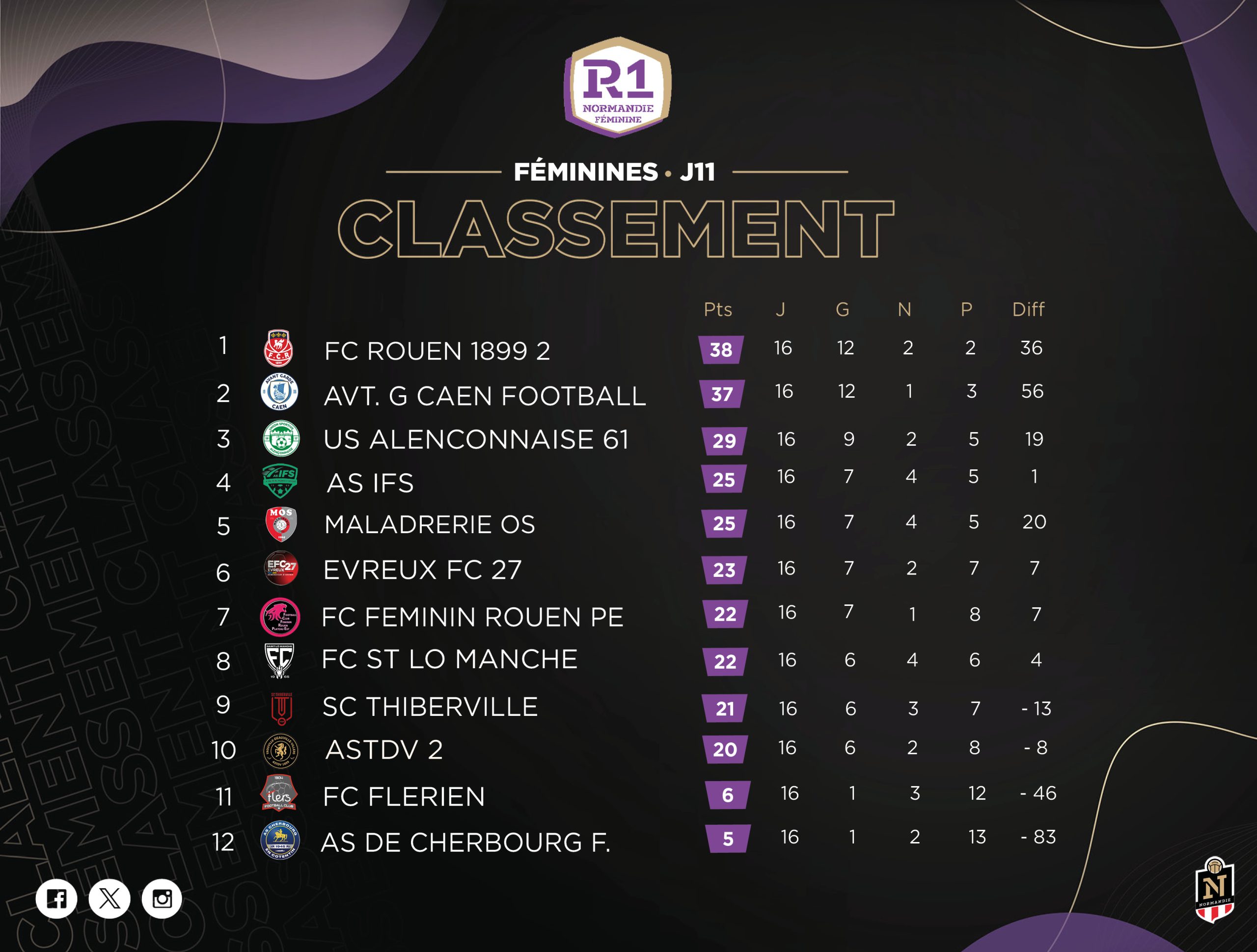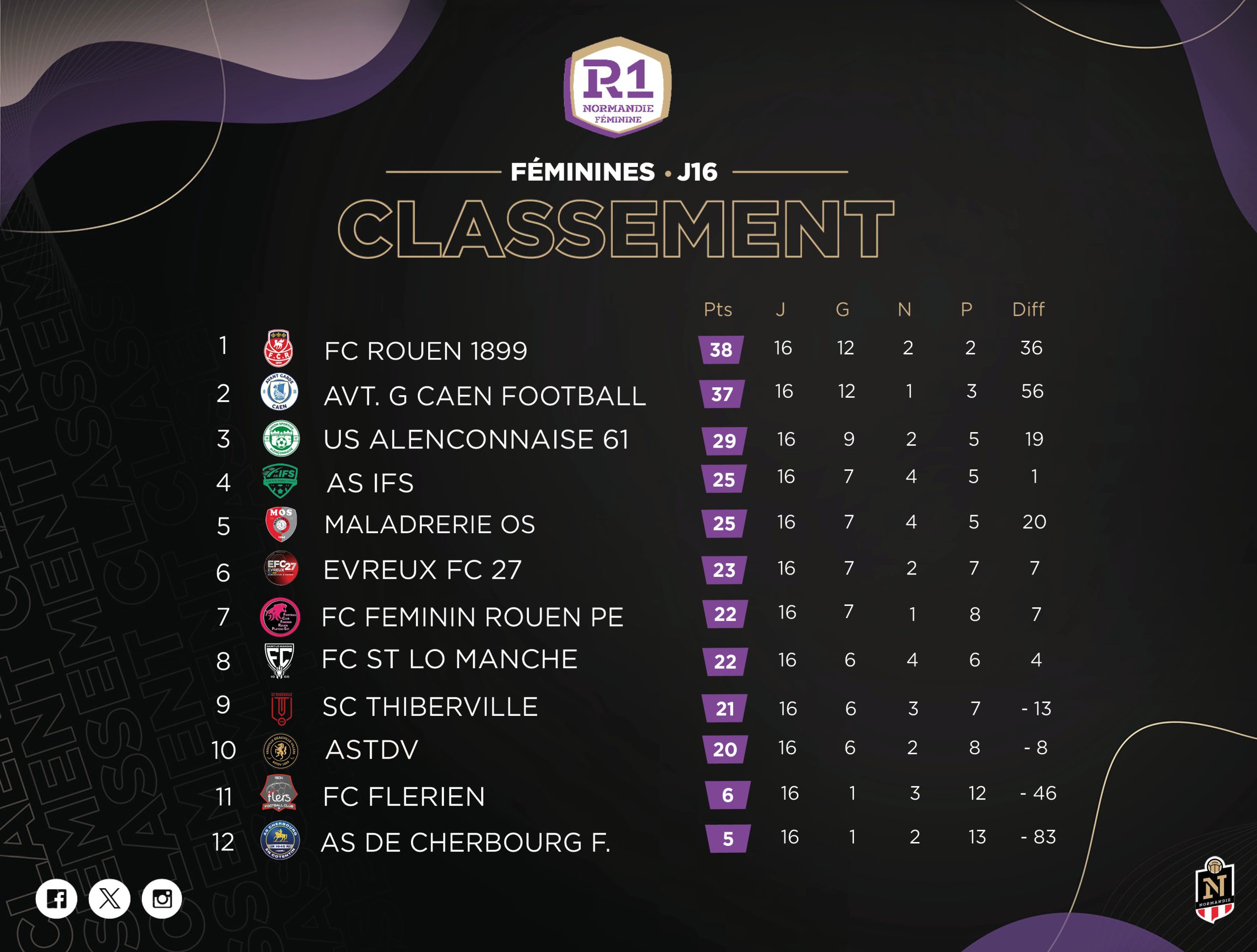 Le duel pour la première place féminine continue : le FC Rouen bat La Maladrerie OS 3-1, tandis que l’AG Caen s’impose largement 9-0 sur Flers et reste à un point du leader.