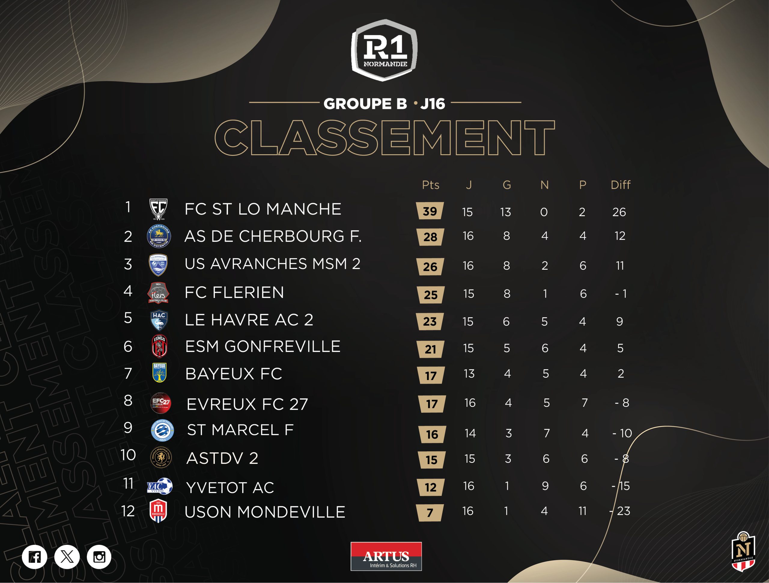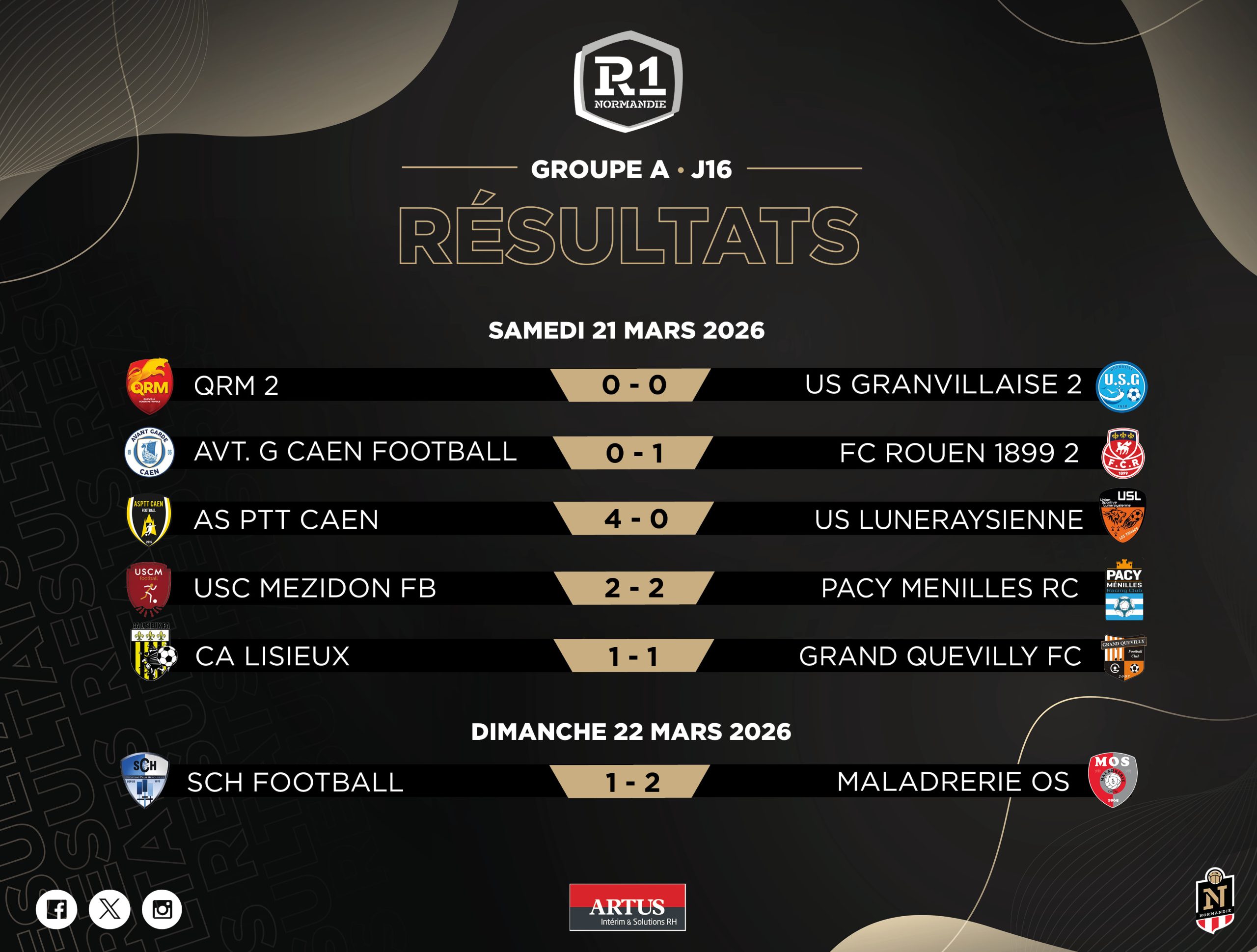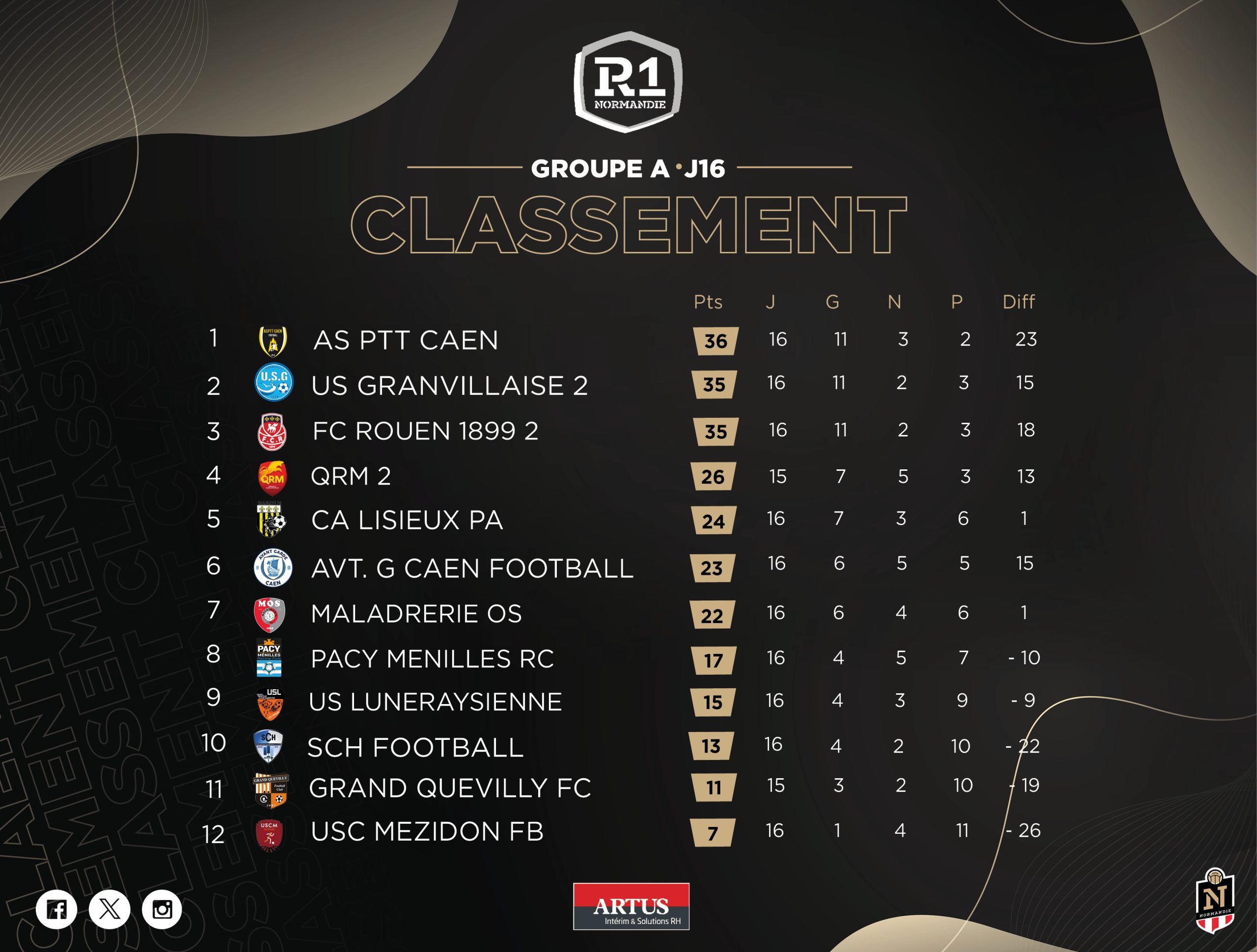 L’AS PTT Caen prend les commandes du Groupe A grâce à un succès de 4-0 contre l’US Luneraysienne. Les Caennais, leaders avec 36 points, sont talonnés par l’US Granville (35 pts) malgré son nul contre QRM, et le FC Rouen 1899 (35 pts) qui complète le trio de tête après sa victoire 1-0 face à l’AG Caen.