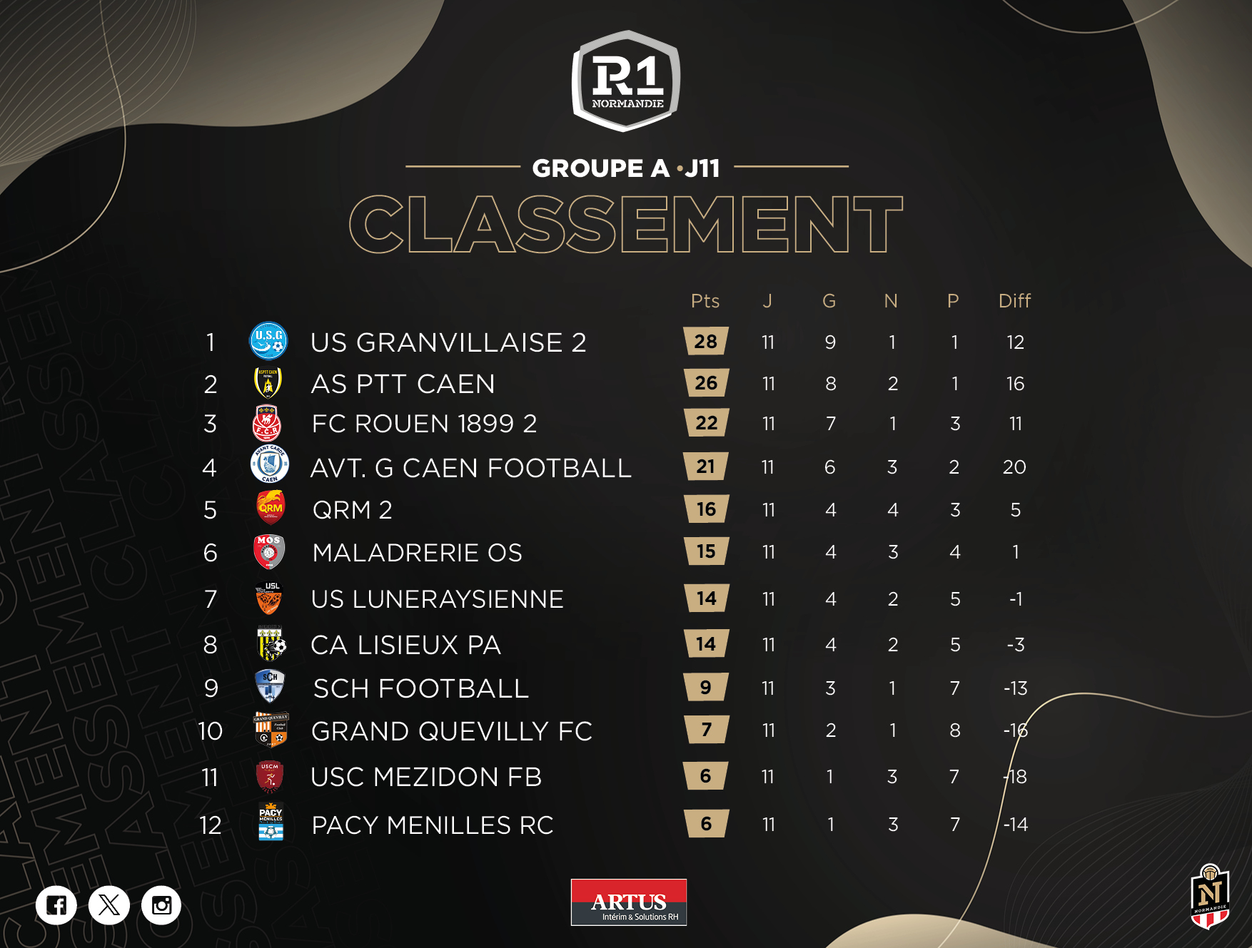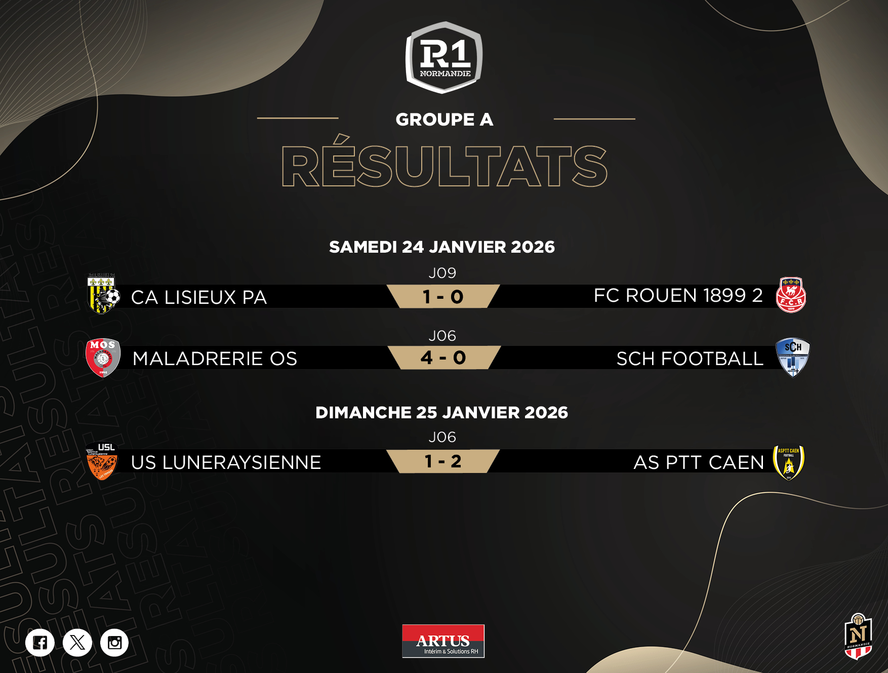 Dans le Groupe A, les équipes en forme ont su répondre présentes. Le CA Lisieux PA a assuré l’essentiel face au FC Rouen 1899 2 avec une victoire courte mais précieuse (1-0), pendant que la Maladrerie OS a marqué les esprits avec un large succès contre SCH Football (4-0), affirmant ses ambitions dans ce championnat. De son côté, l’AS PTT Caen a réalisé une belle opération en allant s’imposer sur la pelouse de l’US Luneraysienne (2-1). Des résultats qui contribuent à resserrer la lutte en tête comme dans le bas de tableau.