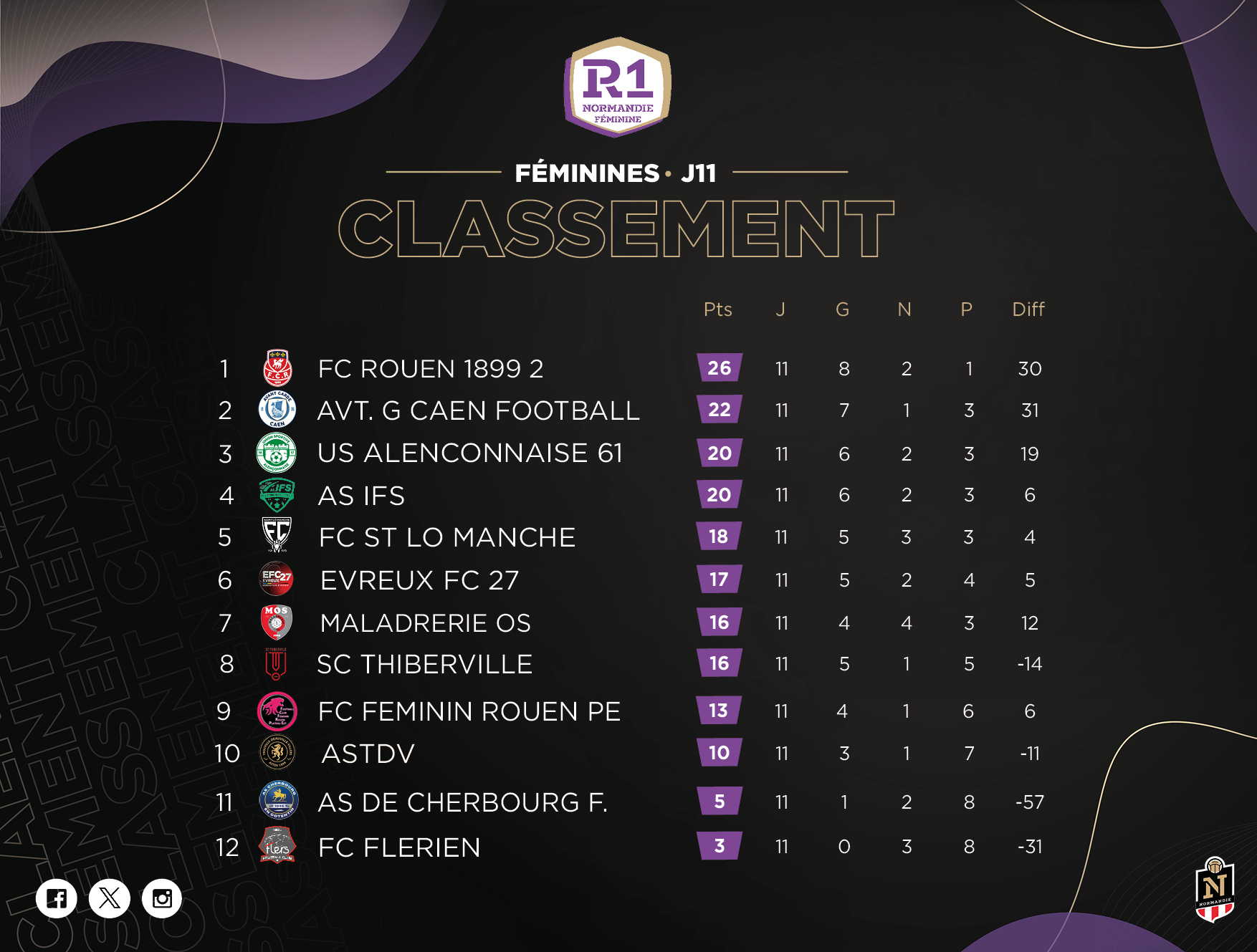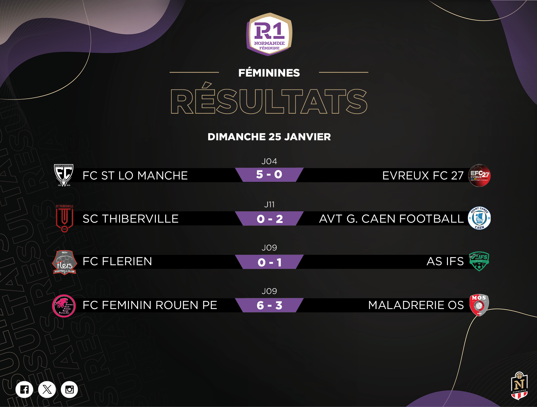 Chez les Féminines, cette journée a été marquée par de belles performances collectives et un grand sens du spectacle. Le FC Saint-Lô Manche a impressionné face à Évreux FC 27 avec un large succès (5-0), pendant que l’AVT G. Caen Football s’imposait avec sérieux sur le terrain du SC Thiberville (2-0). L’AS IFS a su faire la différence face au FC Flérien dans un duel très disputé (1-0), tandis que le FC Féminin Rouen PE et la Maladrerie OS ont offert un match spectaculaire, remporté par les Rouennaises (6-3). Des résultats qui confirment le dynamisme et la compétitivité du championnat féminin.