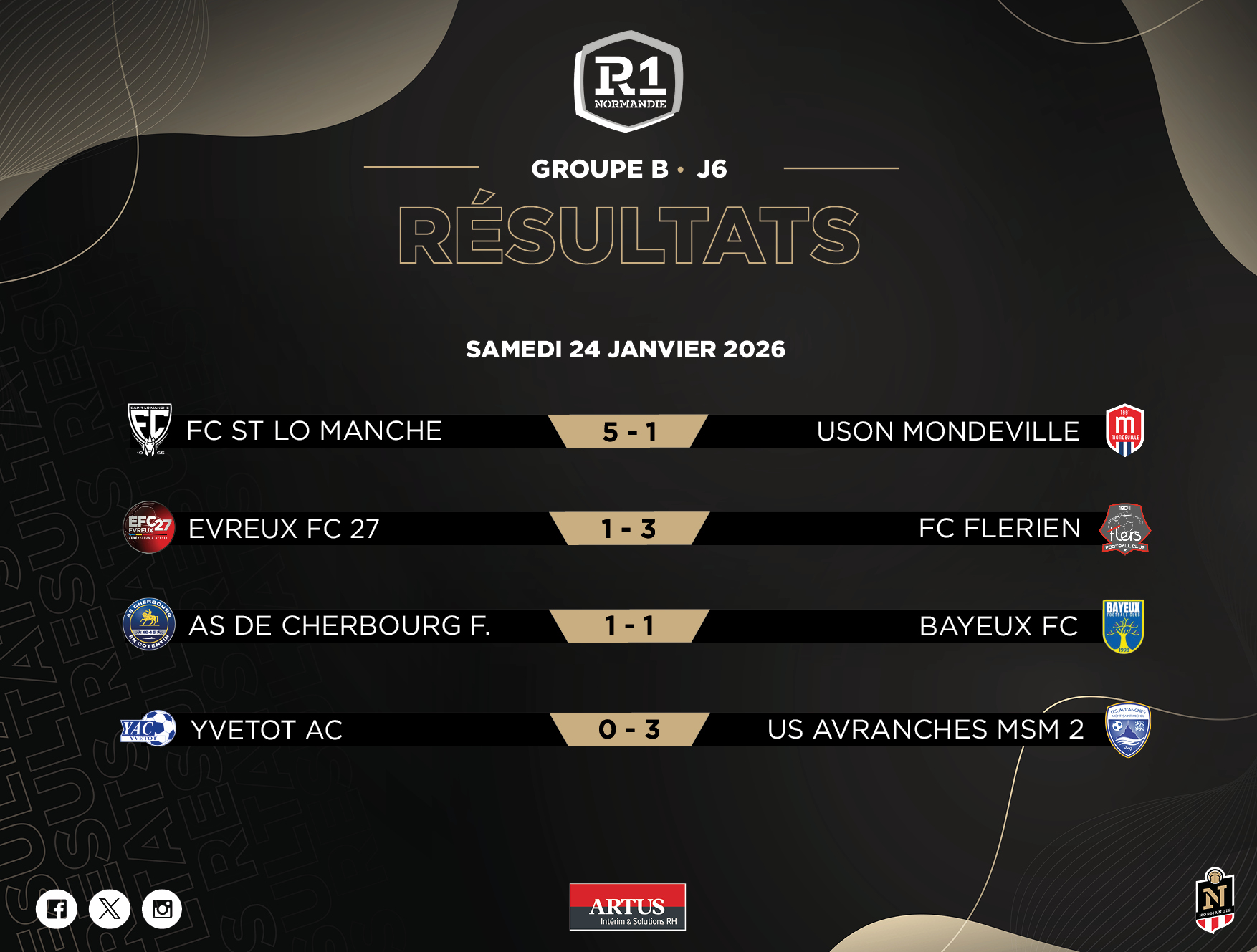 Le Groupe B a offert une journée spectaculaire avec plusieurs rencontres riches en buts. Le FC Saint-Lô Manche s’est illustré avec une victoire éclatante face à l’USON Mondeville (5-1), tandis que le FC Flérien est allé s’imposer à Évreux (3-1), confirmant sa solidité à l’extérieur. L’US Avranches MSM 2 a également frappé fort en dominant Yvetot AC (3-0), pendant que l’AS de Cherbourg F. et Bayeux FC se neutralisaient (1-1) dans une rencontre équilibrée. Autant de résultats qui donnent encore plus de relief à la lutte pour les premières places.