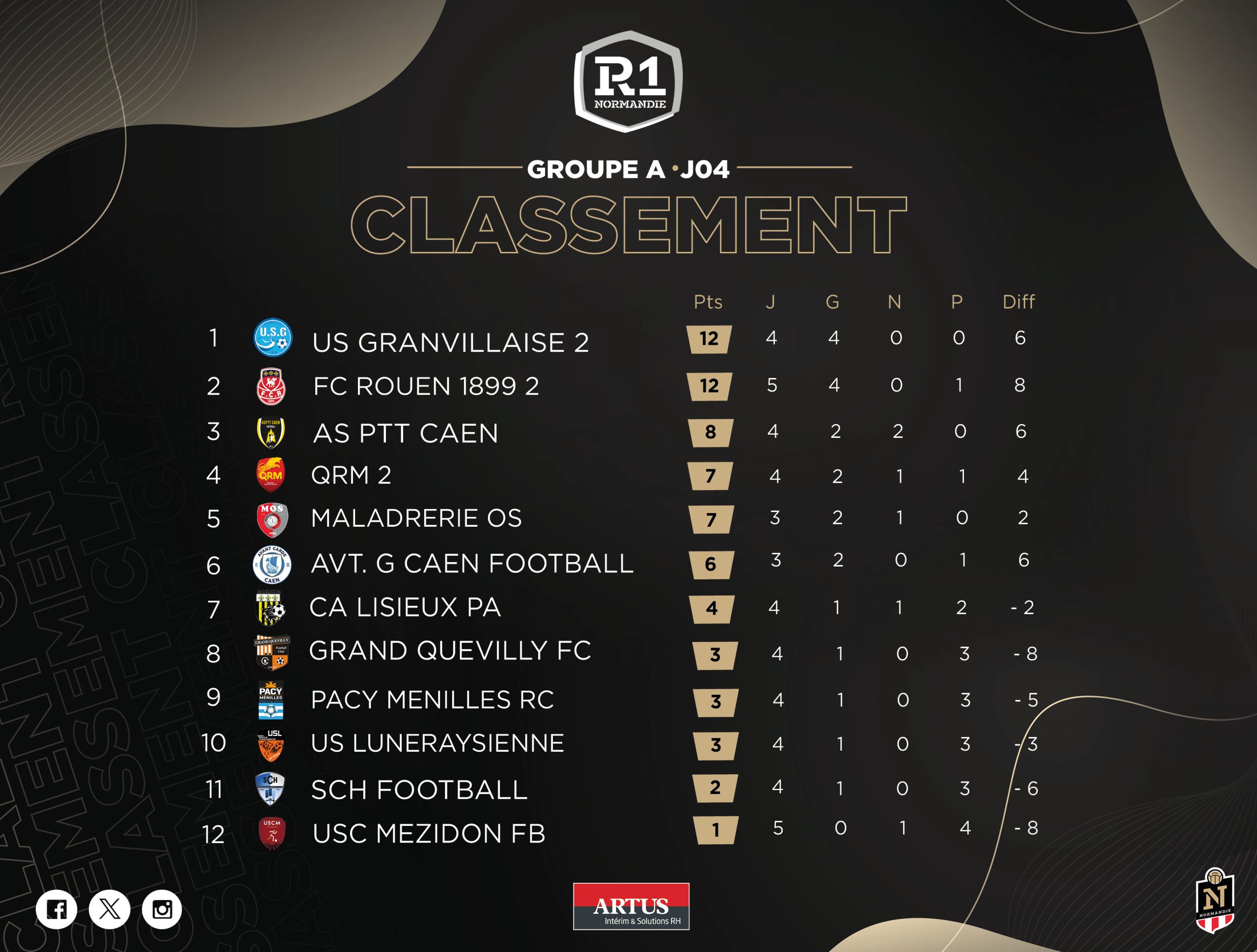 Le classement reste dominé par l’US Granvillaise 2 et le FC Rouen 1899 2, toutes deux à 12 points. Derrière, l’ASPTT Caen complète le podium avec 8 points.
