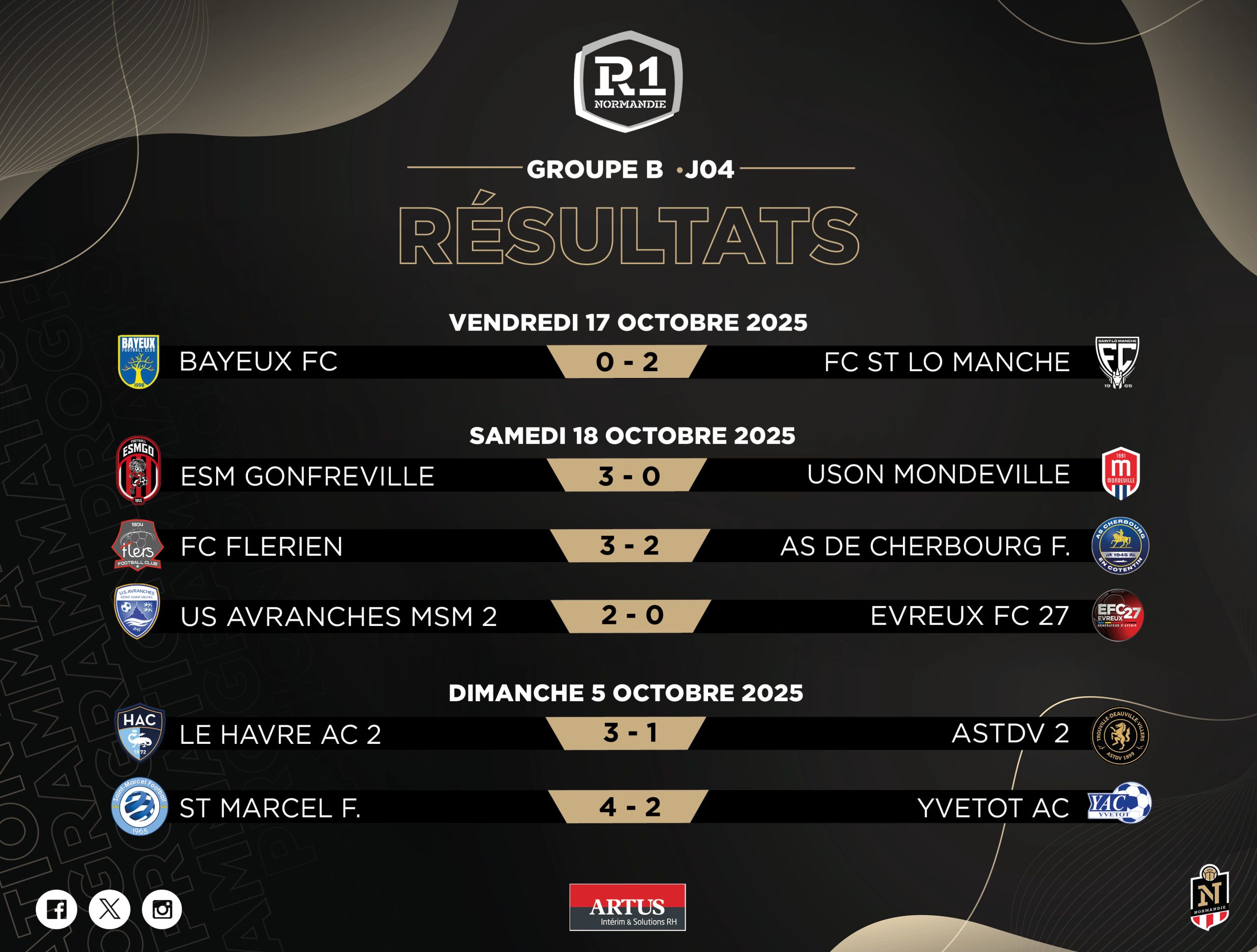 Dans le Groupe B, l’ESM Gonfreville signe une belle première victoire (3-0) face à USON Mondeville. La réserve du HAC reste invaincue après son succès 3-1 face à l’ASTDV 2. Le FC Saint-Lô Manche poursuit sa série avec une victoire 2-0 à Bayeux, tandis que l’US Avranches MSM 2 s’impose également 2-0 contre Évreux FC 27. Enfin, Saint-Marcel Football s’est offert un succès 4-2 contre Yvetot AC, et le FC Flérien a vaincu l’AS Cherbourg sur le score de 3-2.