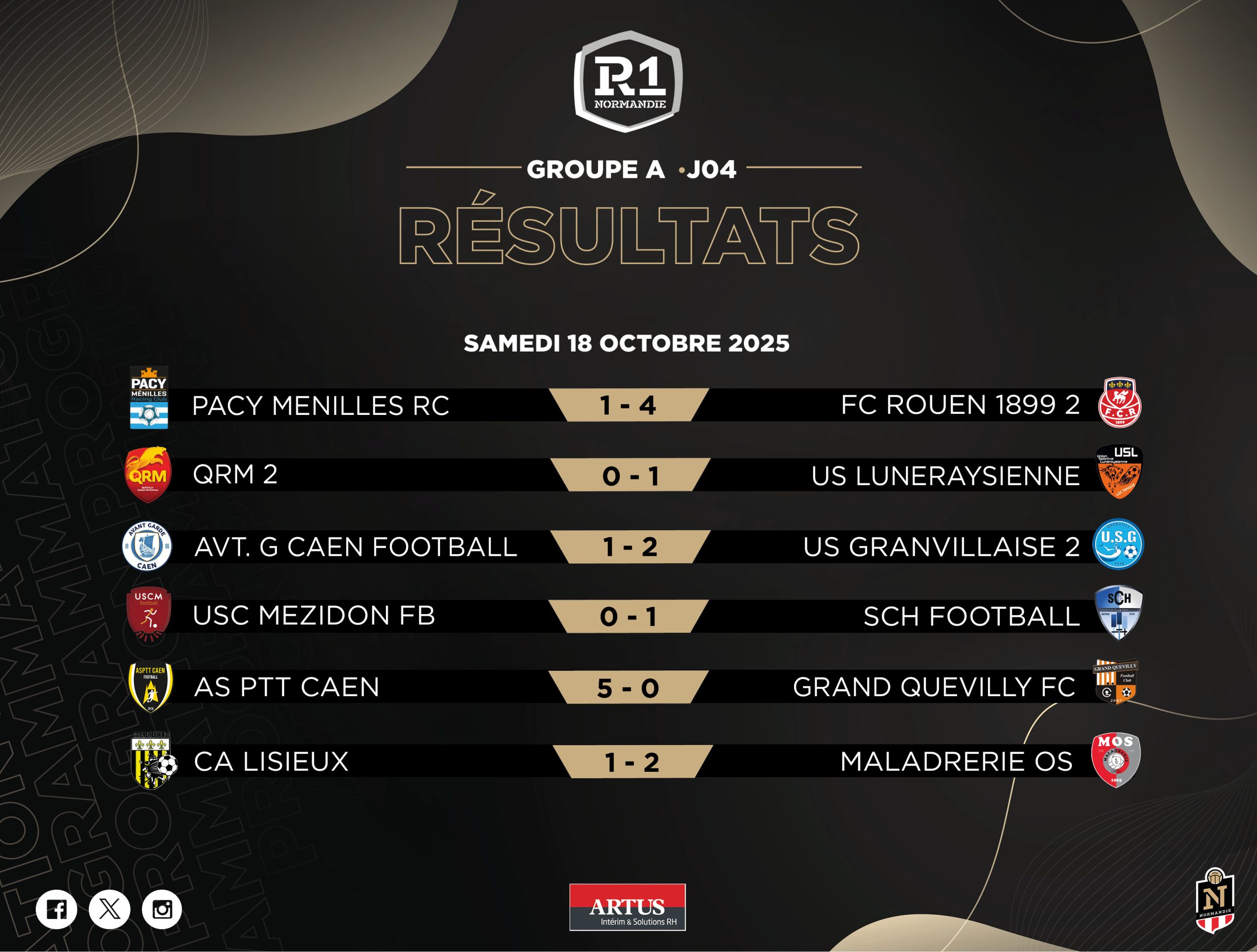 Dans le groupe A, l’US Luneraysienne décroche sa première victoire de la saison en s’imposant 1-0 sur la pelouse du QRM 2. De son côté, l’ASPTT Caen a livré une prestation impressionnante en s’imposant 5-0 face au Grand Quevilly FC. Toujours invaincue, l’US Granvillaise 2 s’impose 2-1 sur le terrain de Avant Garde Caen, conservant sa place de leader du groupe. Dans les autres rencontres, la réserve du FC Rouen 1899 s’est imposée 4-1 à Pacy Menilles, tandis que Maladrerie OS a pris le dessus sur CA Lisieux (2-1).
