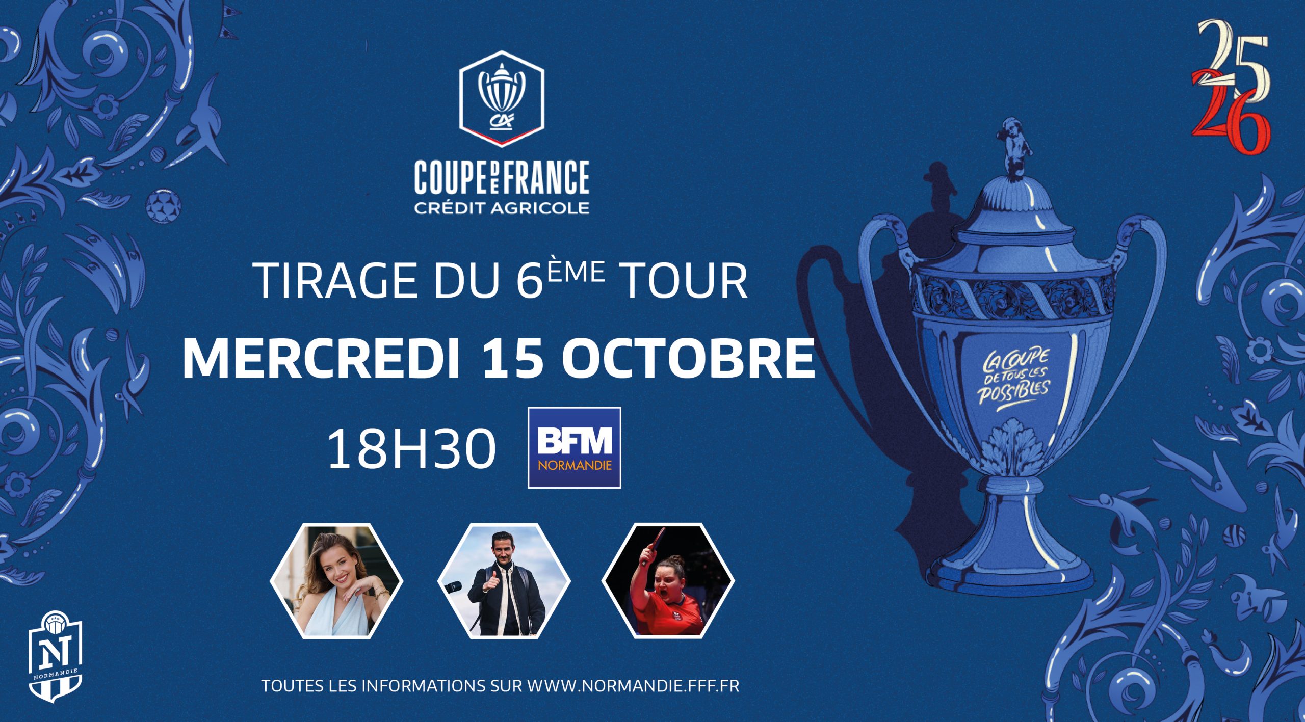 Le tirage au sort du 6ème tour de la Coupe de France Crédit-Agricole se tiendra le mercredi 15 octobre à 18h30 au siège du Crédit Agricole Normandie Seine, situé à Bois-Guillaume (Cité de l’Agriculture).