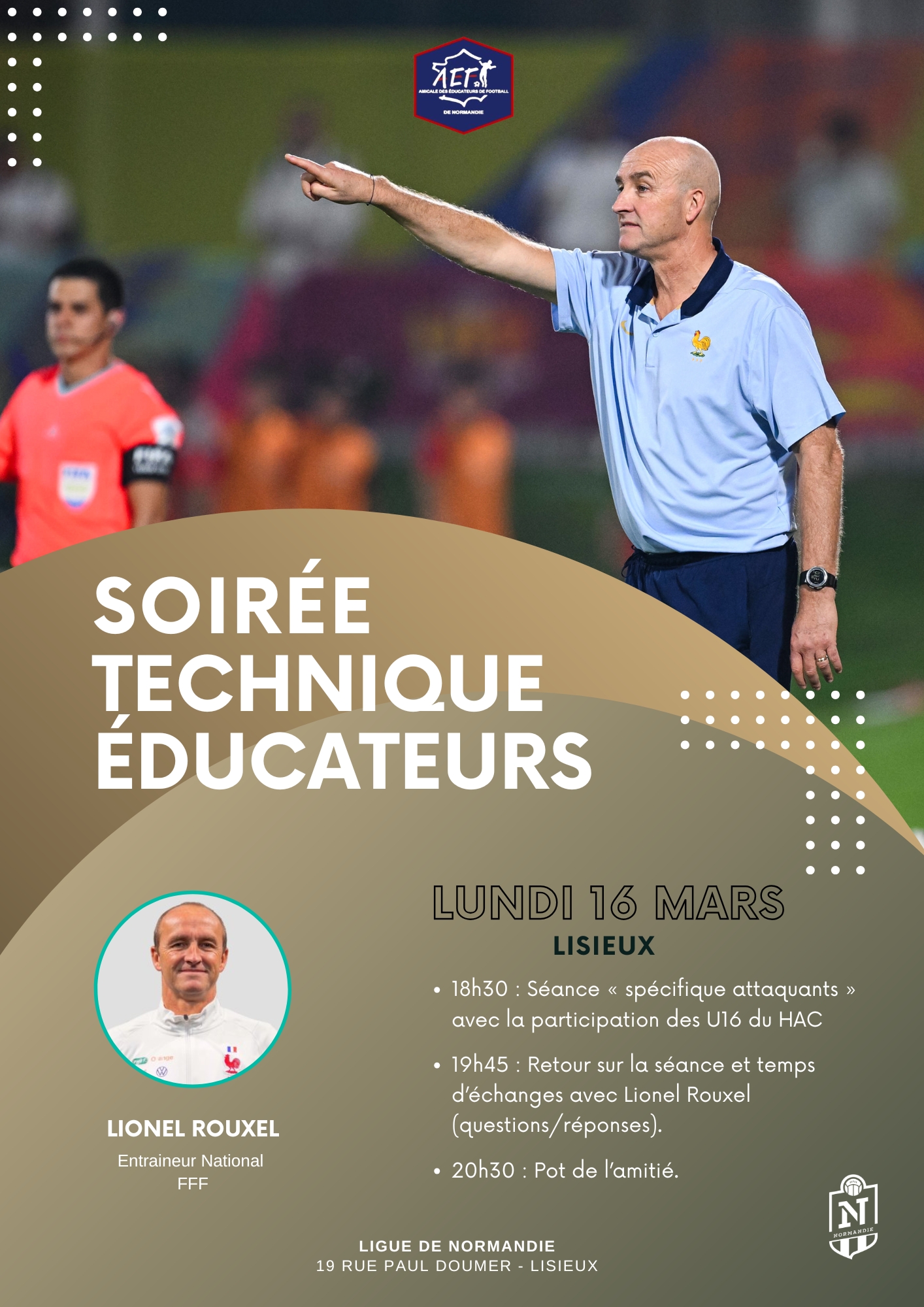L’Amicale des Éducateurs de la Ligue de Football de Normandie organise une soirée technique exceptionnelle en présence de Lionel Rouxel, Entraîneur National. Les éducateurs du territoire sont invités à se retrouver le lundi 16 mars 2026 à partir de 18h30 sur les terrains de la Ligue à Lisieux pour un moment privilégié d’échanges, de partage d’expérience et d’observation autour de l’entraînement, au cœur d’une séance consacrée au travail spécifique des attaquants.